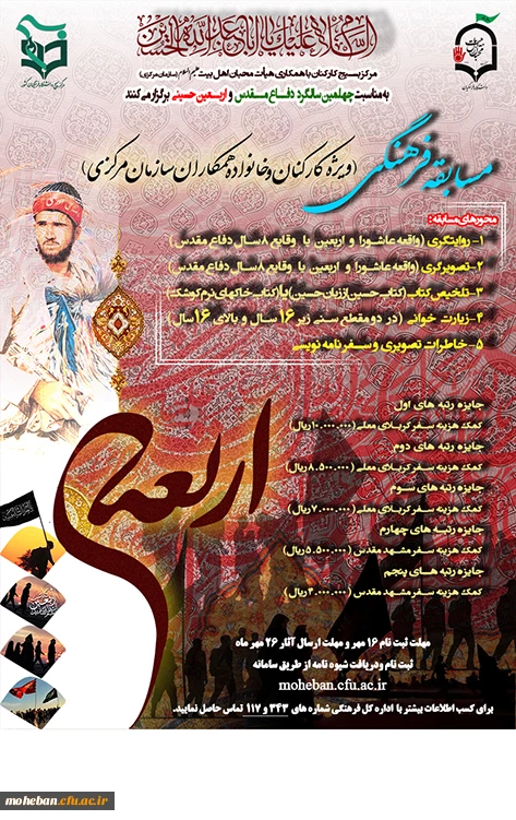 مرکز بسیج کارکنان با همکاری هیأت محبان اهل بیت ع (سازمان مرکزی) برگزار می کند مسابقه فرهنگی به مناسبت چهلمین سالگرد دفاع مقدس و اربعین حسینی (ویژه خانواده کارکنان و همکاران سازمان مرکزی)